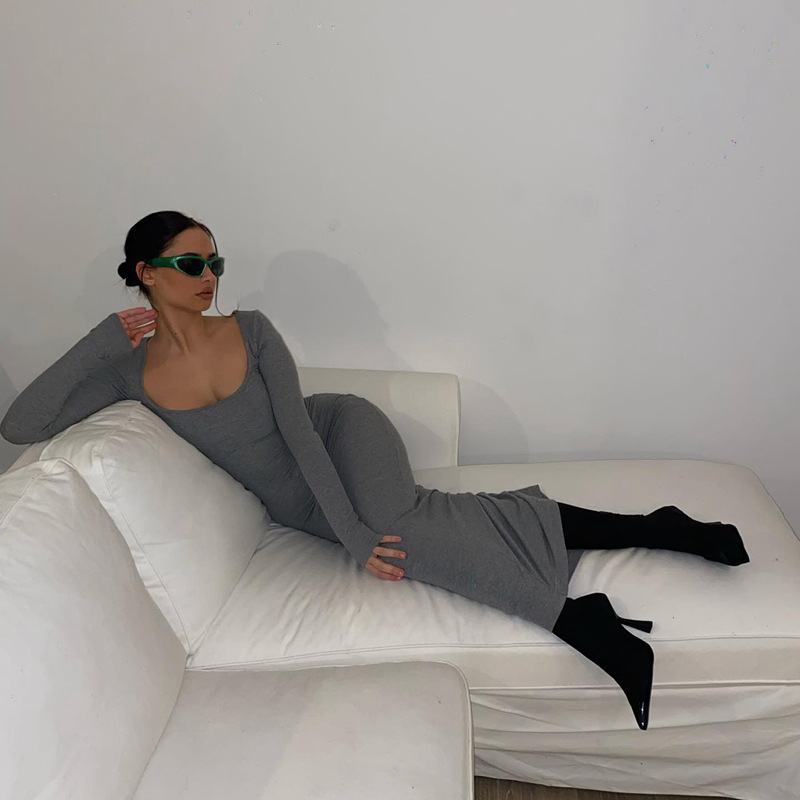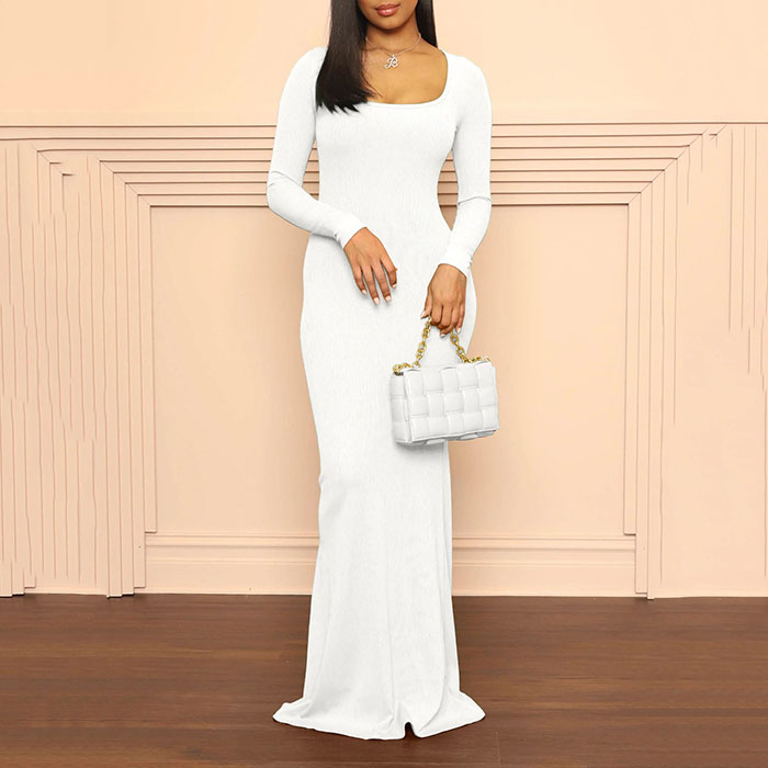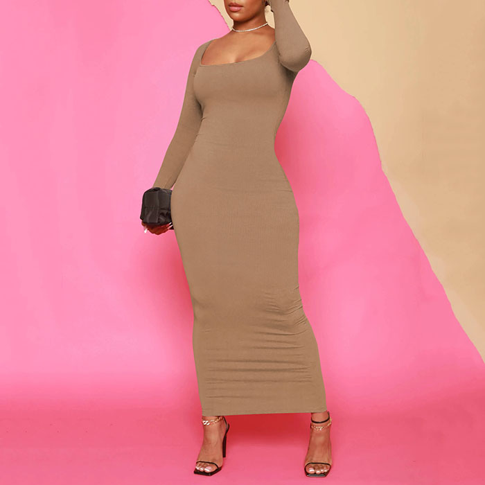 2024 Spring Women's Clothing Wholesale Elegant Party Ribbed Knitted Lounge Wear Bodycon Maxi Long Sleeve Dress